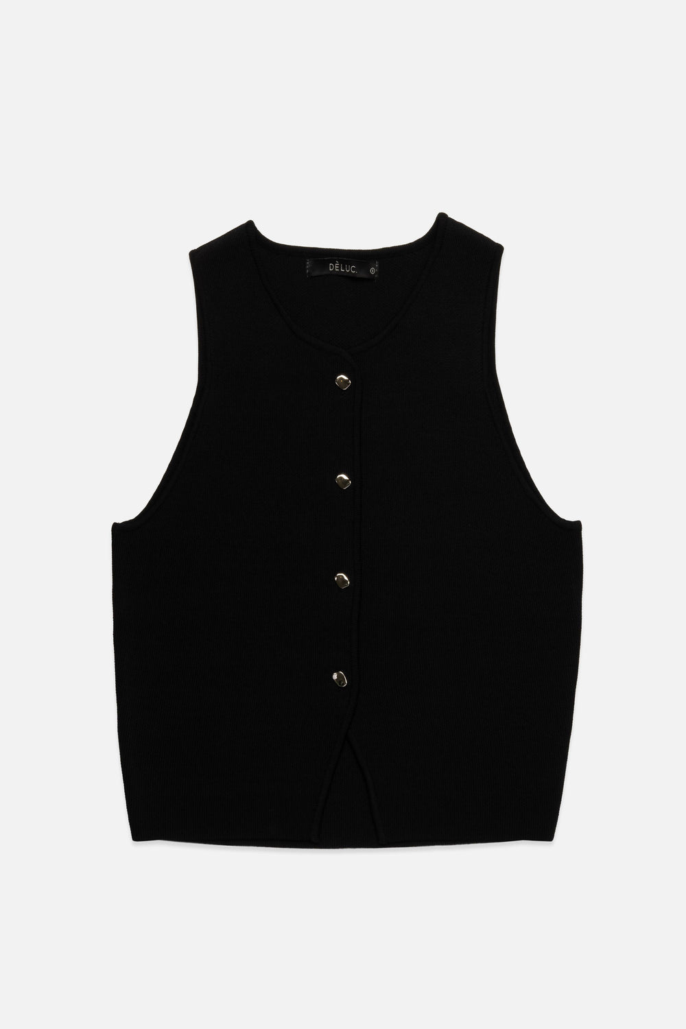 Knitted vest with a round neckline and a front button closure featuring irregular, organic-shaped silver-tone buttons. Designed with a subtle front hem opening that adds visual interest and ease of movement. Made from a compact, stretchy knit that provides a smooth, body-skimming fit.