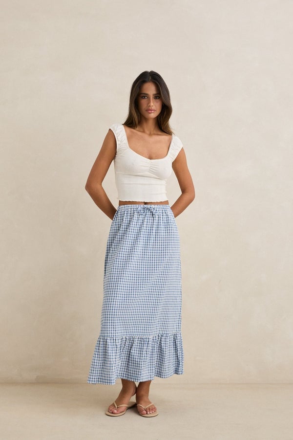 Soft and breezy, the Lola Check Tiered Maxi Skirt in Blue features a high-waisted fit, a full floating silhouette, and a side seam split. An elasticated waistband and self-drawcord complete the easy-wearing design.